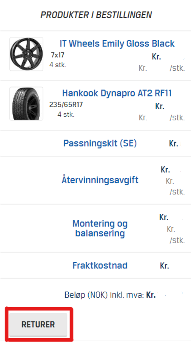 Returkostnaden per dekk/felg/komplett hjul er 450 kr/kolli. Minimumsfakturering er 1500 kr.
